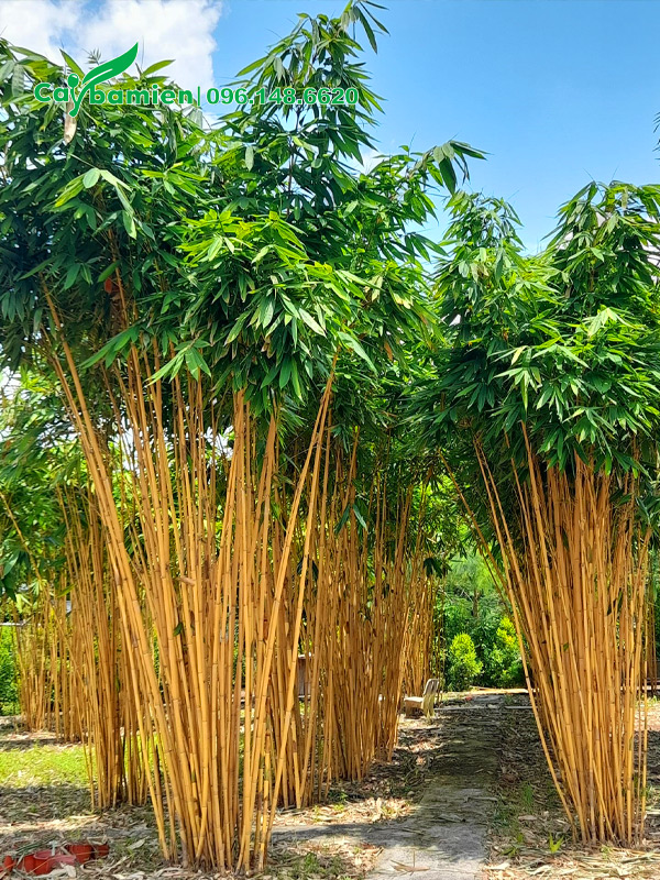 Hình ảnh Hoàng Trúc với thân vàng óng nổi bật, dáng thẳng đẹp mắt, tạo điểm nhấn sang trọng cho không gian sân vườn. Cây có sẵn tại nhà vườn, phát triển tươi tốt, thích hợp làm hàng rào xanh hoặc trang trí lối đi, hàng sẵn số lượng lớn và bao chất lượng.
